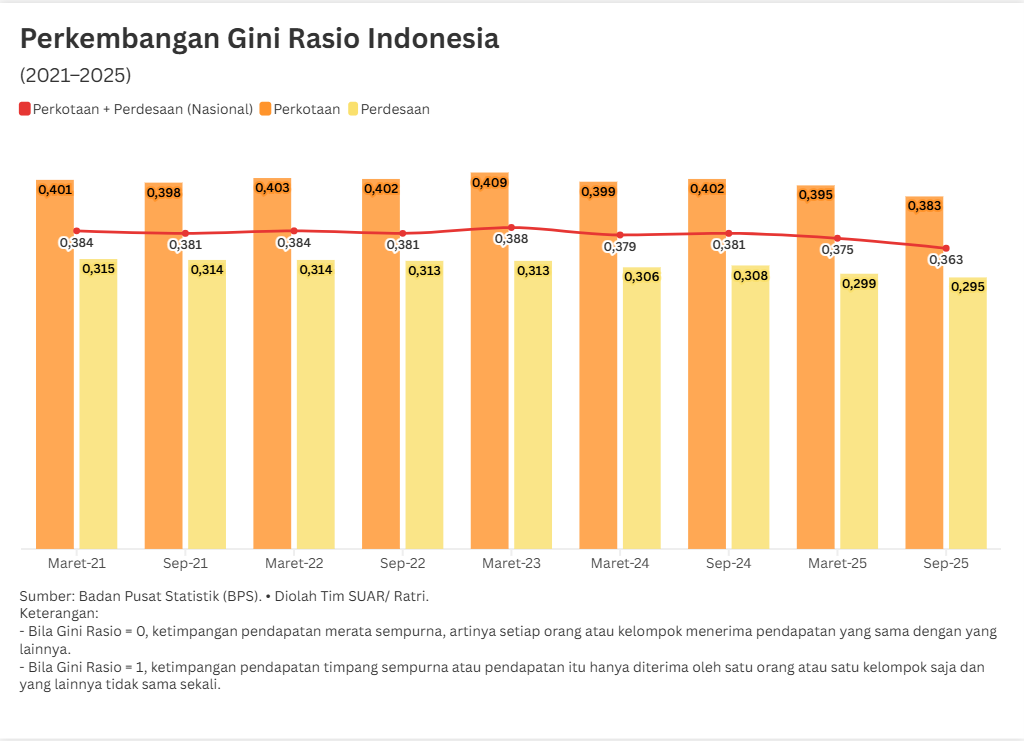 - Ketimpangan kesejahteraan di Indonesia perlahan mulai membaik. Data BPS periode 2021–2025 menunjukkan angka Gini Rasio nasional berhasil ditekan dari angka 0,384 pada Maret 2021 menjadi 0,363 pada September 2025. Namun, sejumlah provinsi masih menunjukkan ketimpangan yang lebar. Rasio gini menunjukkan angka ketimpangan dengan rentang 0-1. Semakin dekat dengan angka 0 maka semakin merata atau tidak timpang, adapun makin besar angkanya menunjukkan ketimpangan yang kian meningkat.