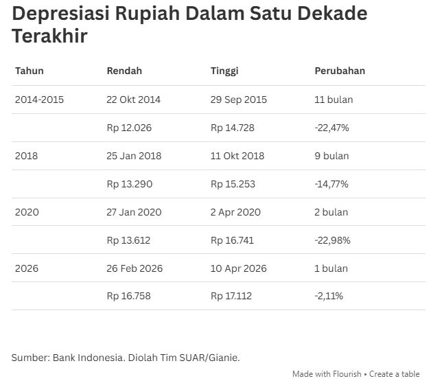 - Depresiasi rupiah bukan kali ini saja terjadi. Dalam satu dekade terakhir, rupiah telah beberapa kali terdepresiasi dengan pelemahan yang cukup dalam, bahkan mencapai 20%. Sejak akhir 2024, nilai tukar rupiah terhadap dolar Amerika Serikat berada di level Rp 16.000. Perang AS-Israel melawan Iran yang dimulai sejak 28 Februari 2026 telah membuat rupiah semakin melemah hingga ke level Rp 17.000. Dalam perang selama 40 hari rupiah terdepresiasi sebesar 2%. Pelemahan terjadi terkait kondisi krisis dalam skala besar, termasuk situasi pandemi Covid-19 yang telah memperlambat geliat perekonomian. Perekonomian Indonesia yang melambat pada tahun 2015 juga terjadi akibat melemahnya nilai tukar rupiah. Selama 11 bulan dari periode 22 Oktober 2014 hingga 29 September 2015, rupiah terhadap dolar AS terdepresiasi sebanyak 22,4%, dari Rp 12.026 menjadi Rp 14.728. Di tahun 2015 tersebut, pertumbuhan ekonomi Indonesia melambat menjadi di bawah 5%, tepatnya 4,79%.