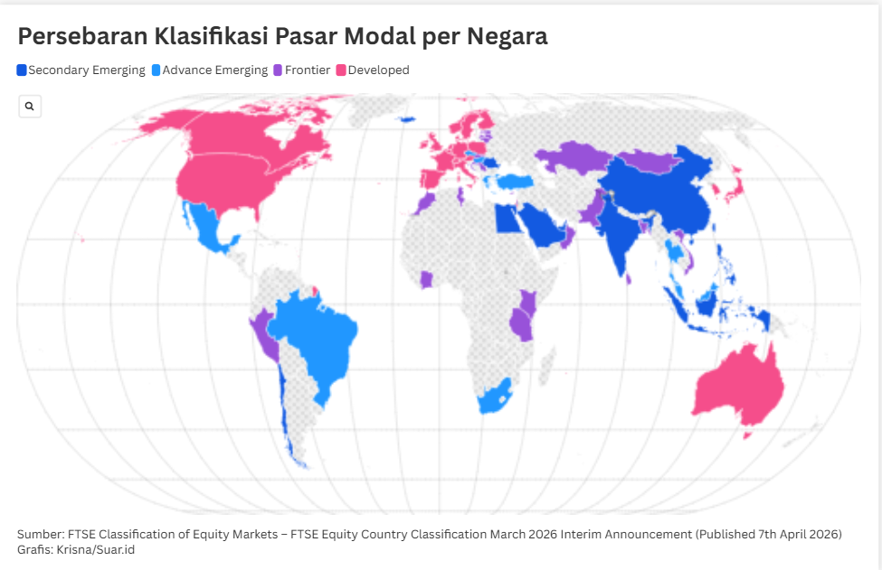 - Lembaga indeks global, Financial Times Stock Exchange (FTSE) Russell, mempertahankan status pasar modal Indonesia sebagai Secondary Emerging Market dalam tinjauan interim April 2026, pada Selasa 7 April lalu. Keputusan ini dikeluarkan usai lembaga tersebut menunda evaluasi Indonesia pada Maret 2026. Kendati jadi katalis positif di tengah upaya reformasi oleh para regulator pasar modal, investor tetap perlu waspada. FTSE membagi pasar modal di sejumlah negara menjadi 4 klasifikasi. Tingkat tertinggi adalah developed; lalu advance emerging; kemudian diikuti secondary emerging; dan frontier. Pengklasifikasian pasar modal tiap negara ini didasarkan berbagai pertimbangan kriteria, antara lain, akuntabilitas, transparansi, potensi & nilai kapitalisasi pasar, kepastian regulasi, dan lain-lain. Posisi Indonesia pada klasifikasi secondary emerging setara dengan negara lain seperti India dan China. Adapun negara-negara dengan klasifikasi developed antara lain Amerika Serikat, Singapura, Kanada, dan lain-lain.