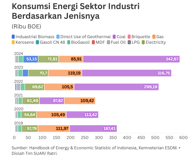 - Hingga tahun 2024, konsumsi energi sektor industri tumbuh stabil di angka 5,3% dengan total mencapai 586,25 ribu BOE. Angka pertumbuhan yang konsisten ini mengonfirmasi bahwa industri adalah mesin utama penggerak ekonomi, meski porsinya dominan dibandingkan sektor lain. Kondisi ini memerlukan perhatian yang serius dalam implementasi kebijakan bauran energi pemerintah. Ketergantungan terhadap energi fosil masih sangat kental jika menilik struktur penggunaan energi berdasarkan jenisnya. Batubara tetap menjadi tulang punggung dengan konsumsi mencapai 342,672 ribu BOE pada 2024, disusul oleh gas alam dan listrik. Namun, penggunaan biomassa industri menunjukkan kenaikan signifikan dari hanya 0,555 ribu BOE di 2019 menjadi 53,147 ribu BOE di 2024.