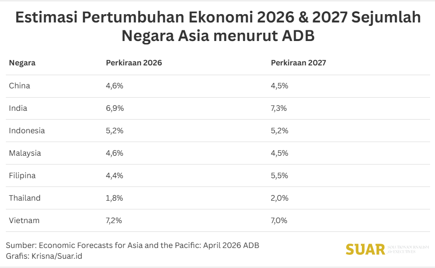 - Asian Development Bank (ADB) memproyeksikan pertumbuhan ekonomi negara berkembang di kawasan Asia Pasifik melambat dari 5,4% menjadi 5,1% pada 2026 maupun 2027 akibat konflik di Timur Tengah dan berlanjutnya ketidakpastian perdagangan. Perlambatan ini diikuti inflasi regional yang diproyeksikan naik menjadi 3,6% pada 2026 dan 3,4% pada 2027, dari sebelumnya 3,0% tahun lalu.