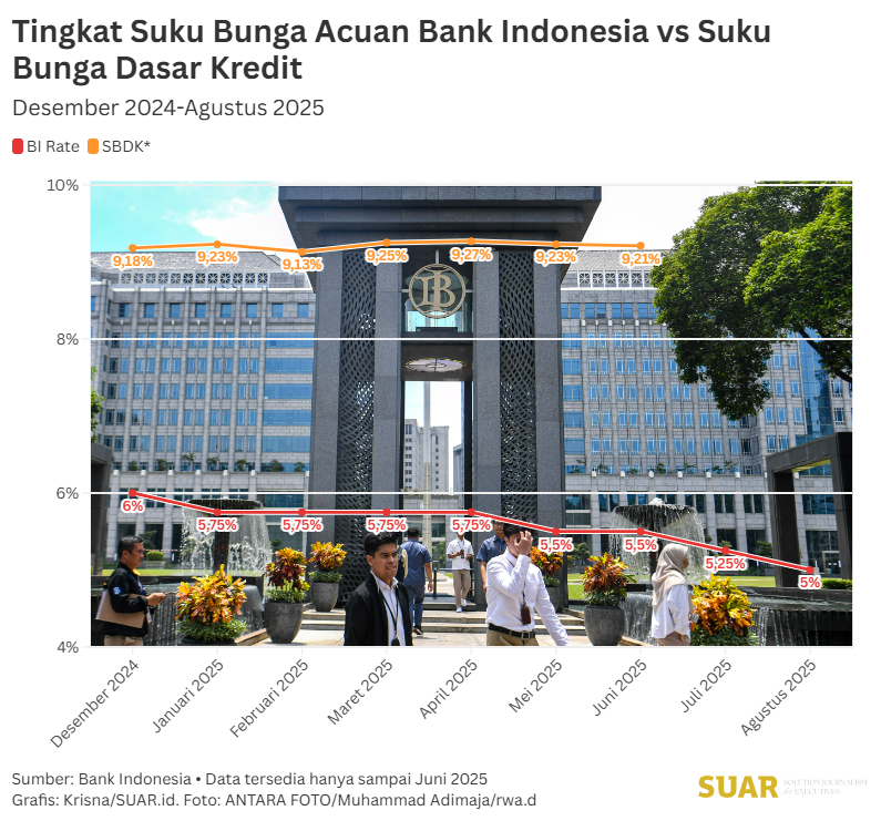 - Sepanjang tahun ini, Bank Indonesia (BI) telah menurunkan suku bunga acuan atau BI Rate hingga total 100 basis poins, sehingga kini posisi BI Rate pada level 5,00%. Sepanjang tahun ini BI sudah empat kali menurunkan suku bunga acuan ini, yakni pada Januari, Mei, Juli, dan Agustus 2025. Masing-masing penurunan sebesar 25 basis poins atau 0,25%. Penurunan BI Rate ini semestinya ikut bertransmisi menjadi penurunan bunga kredit perbankan agar bisa lebih rendah.