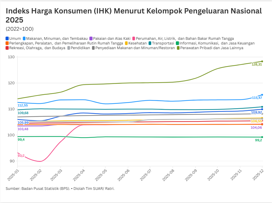 - Lanskap ekonomi Indonesia sepanjang tahun 2025 menunjukkan pergeseran konsumsi yang signifikan, sebagaimana tercermin dalam data Indeks Harga Konsumen (IHK) nasional. Salah satu yang mencolok adalah kelompok perawatan pribadi dan jasa lainnya yang secara konsisten mendominasi pengeluaran masyarakat sepanjang 2025. Pengeluaran untuk perawatan pribadi dan jasa lainnya menjadi kelompok pengeluaran utama masyarakat di tahun 2025, menggeser pengeluaran untuk makanan dan minuman. Selain itu, kondisi geografis juga menentukan prioritas pengeluaran masyarakat.
