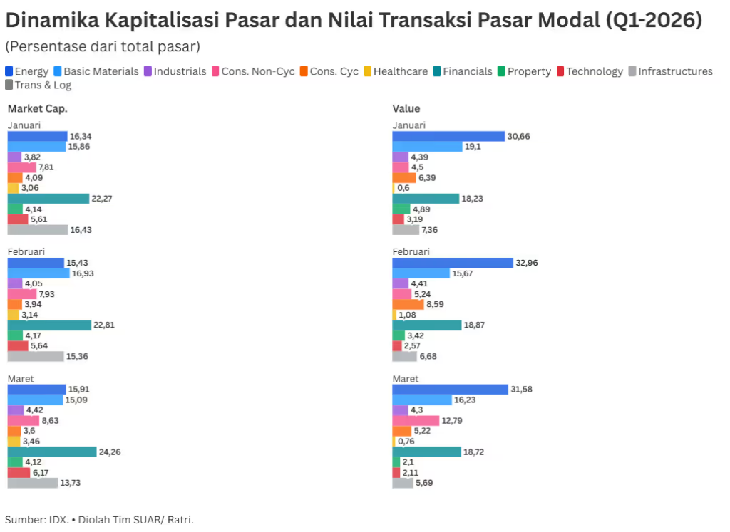 - Pasar modal Indonesia melewati kuartal pertama (Q1) tahun 2026 dengan dinamika yang cukup kontras. Optimisme yang terbangun di awal tahun seketika diuji oleh eskalasi konflik di Timur Tengah pada bulan Maret. Geopolitik global telah memicu penurunan volume transaksi di bursa saham dan pergeseran nilai kapitalisasi pasar yang signifikan. Meski demikian, struktur pasar modal menunjukkan pola adaptasi di mana investor menimbang ulang profil risiko mereka dan beralih ke sektor-sektor yang dianggap memiliki fundamental lebih kuat di tengah ketidakpastian.