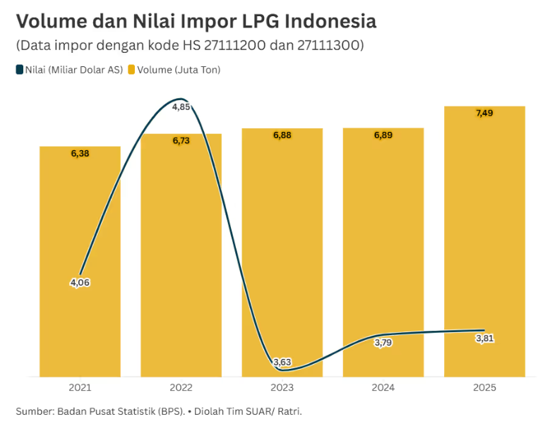 - Berdasarkan data laporan Handbook of Energy & Economy Statistics of Indonesia (Kementerian ESDM), angka penjualan LPG nasional telah melonjak dari 6,09 juta ton pada 2014 menjadi hampir 9 juta ton pada 2024. Ketimpangan yang terjadi karena konsumsi lebih tinggi dibandingkaan produksi harus ditutup melalui jalur impor. Porsi impor LPG kini mencapai sekitar 78% dari total kebutuhan nasional. Memasuki tahun 2025, ketergantungan ini semakin nyata dengan volume impor yang menembus angka 7,49 juta ton melalui catatan data BPS terbaru. Dominasi impor ini menunjukkan bahwa kapasitas produksi dari kilang minyak (oil refinery) maupun kilang gas (gas refinery) dalam negeri belum mampu mengejar laju permintaan yang meningkat rata-rata 3-5% per tahun.