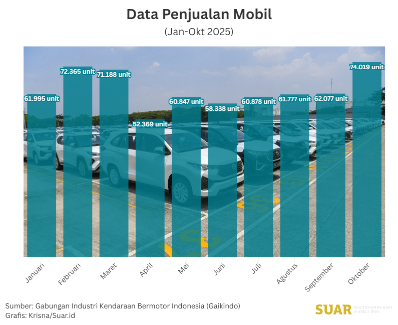 - Citing data from the Indonesian Automotive Industry Association (Gaikindo), car sales in October 2025 were the highest so far this year. October 2025 sales grew 19.23% compared to September 2025. However, on an annual basis it decreased by 4.4% compared to October 2024 sales of 77,404 units. Likewise, January-October 2025 sales were still lower than the same period last year. In January-October 2025, car sales reached 635,844 units, down 10.64% compared to January-October 2024 sales of 711,604 units.