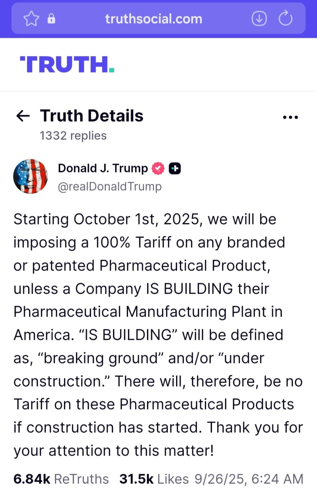 "Starting October 1, 2025, we will impose a 100% tariff on any branded or patented pharmaceutical product, unless the company is building a pharmaceutical plant in America," Trump wrote on his Truth Social account on Thursday (25/9/2025).