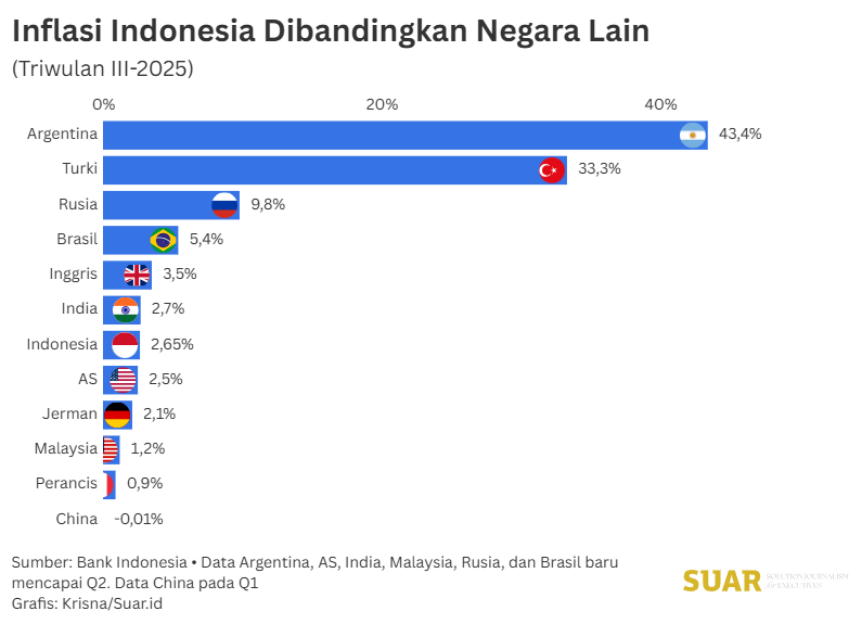 - President Prabowo Subianto highlighted that one of the achievements of his one-year administration was being able to control inflation. On several occasions, the President even claimed that many other countries wanted to learn how to control inflation from Indonesia. Prabowo said that Indonesia has techniques to monitor and control inflation that are not taught by the world's economic faculties. Citing data from the Central Statistics Agency (BPS), the general inflation rate in September 2025 was at 2.65% on an annual basis. This is still within the target range of Bank Indonesia (BI) and the 2025 state budget, which is 1.5%-3.5%. Indonesia's inflation is lower than other countries, such as Turkey which reached 33.3% in the third quarter of 2025 and Argentina which amounted to 43.4% in the second quarter of 2025. Indonesia's inflation is also lower than Brazil's 5.4% and Russia's 9.8%.