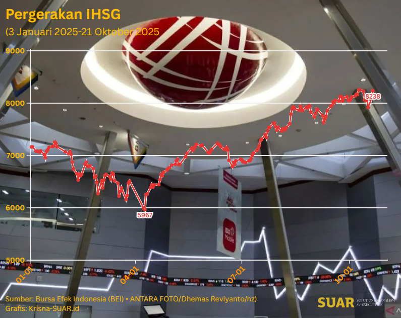 - The Composite Stock Price Index (JCI) had fallen from the psychological point of 8,000. However, now the JCI is back on the rise and is even expected to continue to rise due to a number of positive sentiments. The JCI last week showed a weakening of 2.57% to 7,906 at the close of trading on Friday (17/10/2025). This figure managed to rebound 2.19% to 8,115 at the opening of trading on Monday (20/10/2025) and Tuesday (21/10/2025) closed 1.84% higher at 8,238.08. Regarding this week's trading forecast, both Indri and Alfred said, JCI has the potential to strengthen due to the projected BI Rate cut and the release of important US economic data.