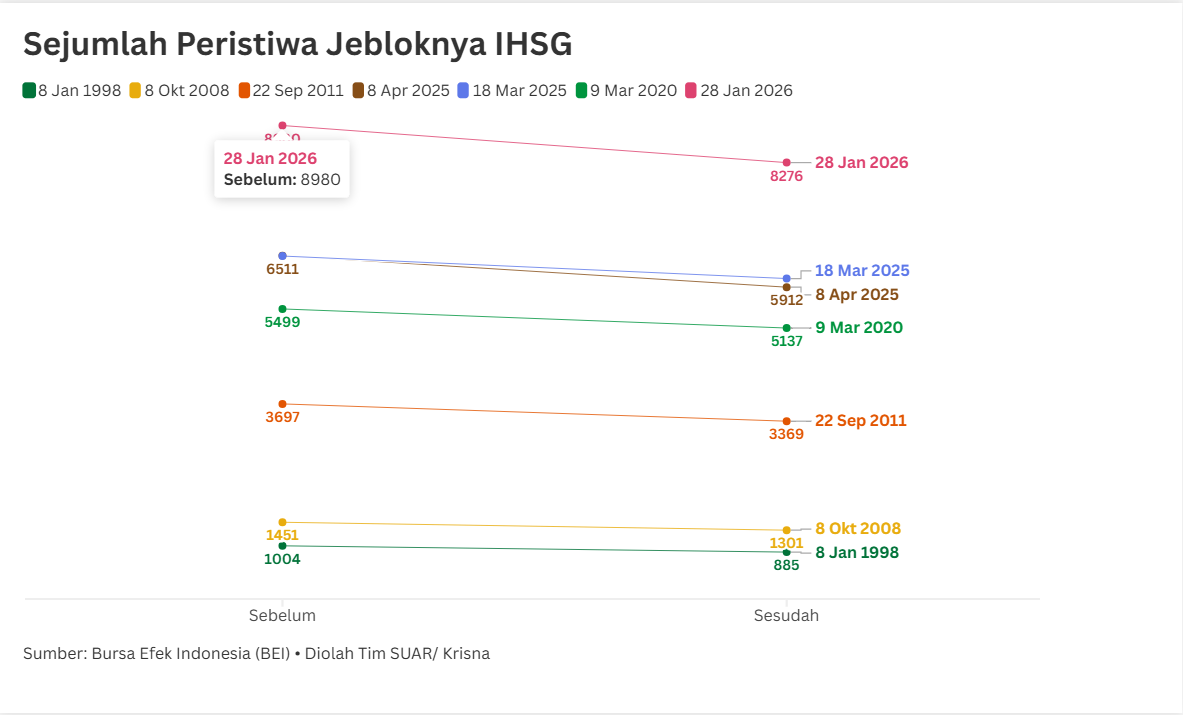 Belum selesai para investor babak belur dihajar "longsor" Indeks Harga Saham Gabungan (IHSG) pada perdagangan Rabu (28/1/2026), indeks pasar modal tanah air kembali jeblok pada Kamis (29/1/2026). Hanya dalam 2 hari IHSG terperosok dalam hingga 748 poins.