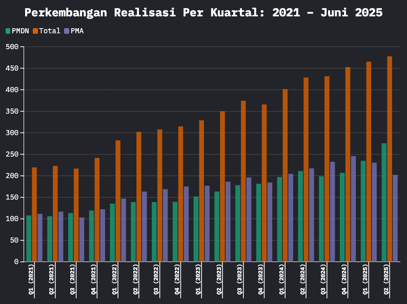 Citing data from the Ministry of Investment and Downstream Affairs/Investment Coordinating Board (BKPM), investment realization in the second quarter of 2025, which reached IDR 477.7 trillion, increased from the first quarter of 2024 of IDR 465.2 trillion.
