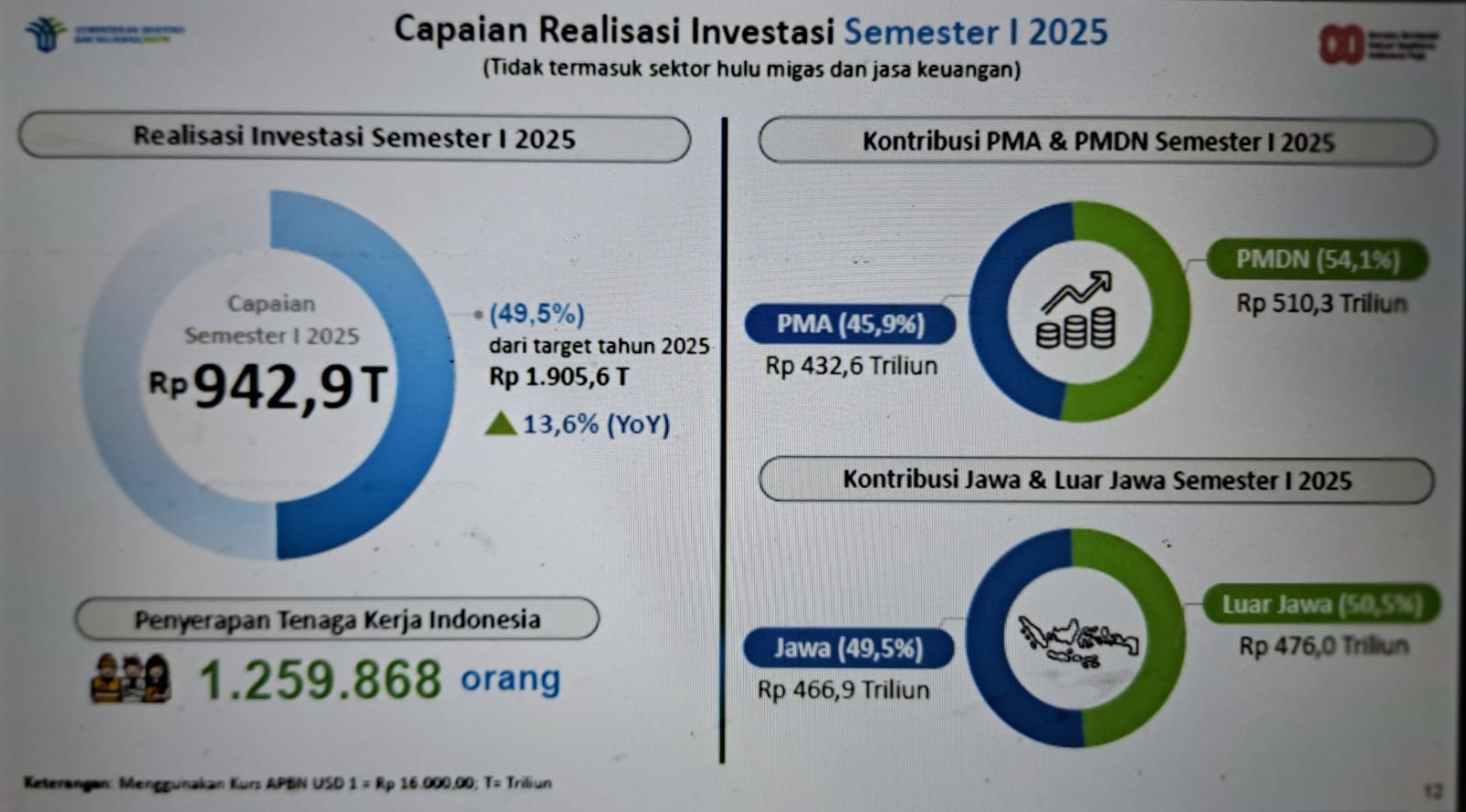 Thus, the total investment realization throughout the first semester of 2025 has reached Rp 942.9 trillion, or almost 50% of the government's target of Rp 1,905.6 trillion for 2025.