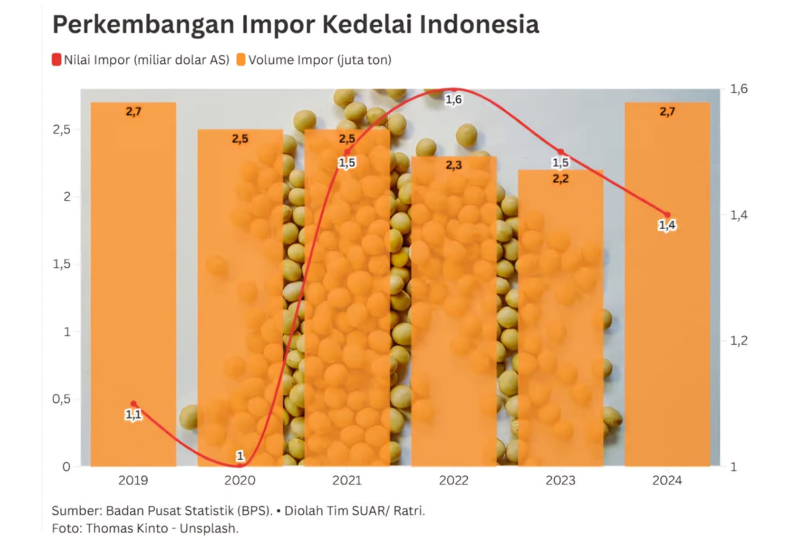 - Data from the Central Statistics Agency (BPS) shows that the trend of Indonesia's soybean import volume is stable, with an average of over 2.5 million tons per year. In 2019, the soybean import volume was 2.7 million tons. It dropped to 2.2 million tons in 2023, but surged again to 2.7 million tons in 2024. Meanwhile, the import value also fluctuates with the dynamics of global prices and exchange rates, reaching a peak of US$1.6 billion in 2022. The high volume of soybean imports is inseparable from the large demand or national soybean consumption, which reaches around 2.9 million tons to 3 million tons per year.