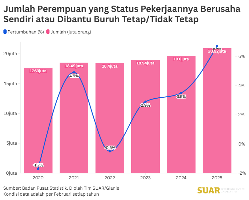 - Indonesian women who work continue to grow. As of February 2025, based on data from the Central Statistics Agency (BPS), the figure reached 58.4 million people or around 40% of the total working population. Of this number, those whose employment status is self-employment, including those assisted by permanent and non-permanent laborers, reached 20.9 million people (35.8%).