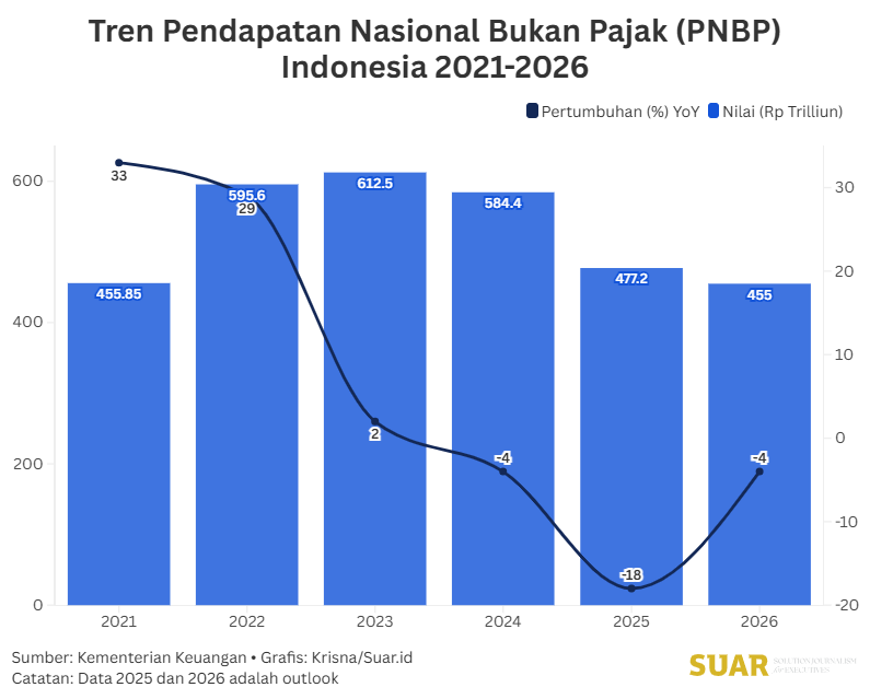 - Behind the tug-of-war over this strategic project, the condition of PNBP is not encouraging. As of the first semester of 2025, PNBP collected Rp 222.9 trillion or 43.4% of the 2025 State Budget target of Rp 513.8 trillion. This condition contrasts with government projections. In the 2026 Draft State Budget, the PNBP target is only set at IDR 455 trillion, lower than the 2025 outlook of IDR 477.2 trillion, as well as far below the 2024 realization of IDR 584.4 trillion.
