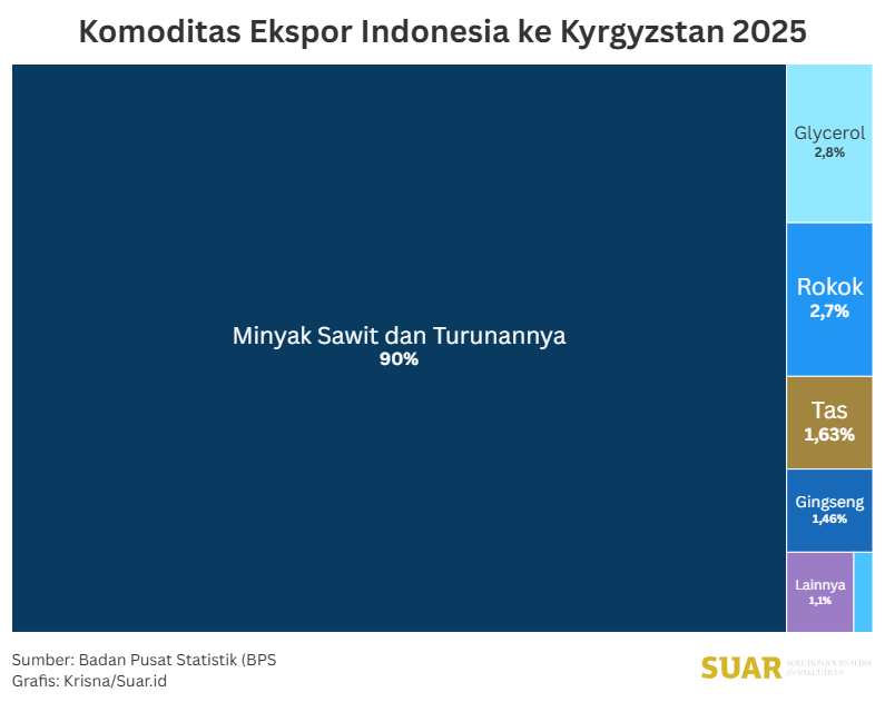 - Indonesia is exploring opportunities for developing halal industry cooperation with Kyrgyzstan, opening new breakthroughs for exports to non-traditional countries. Based on data obtained from the Ministry of Trade, the trade value between Indonesia and Kyrgyzstan is still relatively small. Recorded in 2024, the value was US$ 1.8 million, while from the January-August 2025 period it reached US$ 1.4 million. Indonesia exports 19 HS (Harmonized System) code commodities, including palm oil and its derivatives, glycerol chemicals, cigarettes, bags, ginseng, garments, and others. Indonesia's exports to Kyrgyzstan are dominated by palm oil and its derivative products, which account for around 90% of total exports.