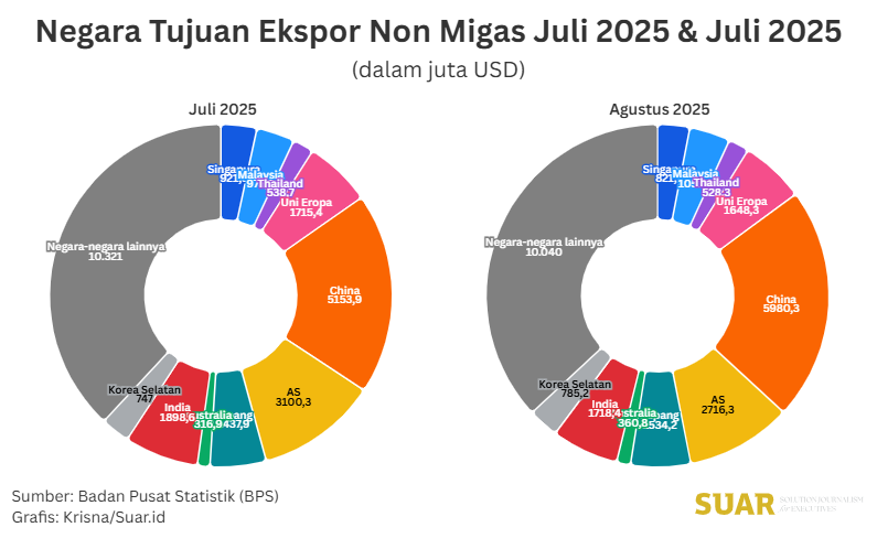- Indonesian exports remained stable, growing 0.86% after the enactment of President Trump's new tariffs. A number of countries are supporting the stability of Indonesia's export value, one of which is Malaysia. Exports to neighboring countries in August recorded the highest record of 1,051.4 million US dollars (up 7.80%), driven by a surge in downstream commodities such as processed palm oil. This figure is recorded as the highest figure this year. This increase underscores the importance of the ASEAN regional market, which as a whole is Indonesia's main non-oil and gas export destination with a share of 19.42%.