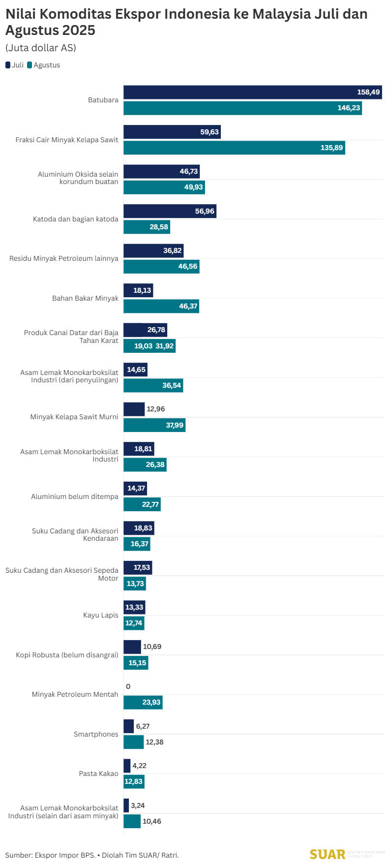 - If we look in more detail, the main commodities of oil and gas and non-oil and gas exports to Malaysia in July and August 2025 experienced changes. In August, superior commodities such as liquid fractions of refined palm oil (HS code 15119037) experienced a significant jump from US$59.63 million to US$135.89 million, making it the second leading export commodity after coal. In addition, fuel oil (HS 27101979) also jumped to US$46.37 million, reflecting an increase in energy demand.