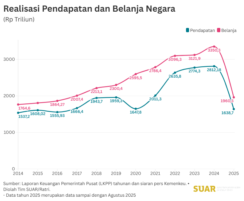 - As of August 31, 2025, state revenue realization has only reached Rp 1,638.7 trillion, or 57.2% of the outlook for the 2025 State Budget. Meanwhile, state spending realized in the same period has only reached Rp 1,960.3 trillion, or 55.6% of the outlook for the 2025 State Budget. The deficit amounts to Rp 321.6 trillion, or 1.35% of GDP.
