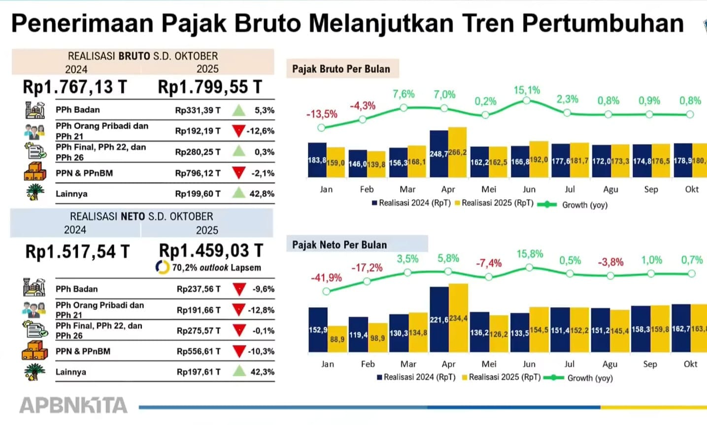 Deputy Minister of Finance Suahasil Nazara stated that as of October 31, 2025, state revenues have collected Rp2,113.3 trillion or 73.7% of the 2025 State Budget target. Of this amount, gross tax realization reached Rp1,799.5 trillion, while net realization after restitution reached Rp1,459.03 trillion or 70.2% of the target. From this calculation, net corporate income tax growth is still negative, even though net tax growth reached 0.7% year-on-year (YoY).