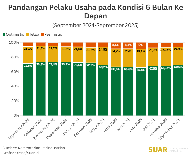 When broken down, 69.6% of businesses felt optimistic. The number increased by 1.5% compared to the previous month's percentage. Ministry of Industry Spokesperson Febri Hendri Antoni Arief added, as many as 24.3% of business actors stated that their business conditions were stable and remained in an expansion position.