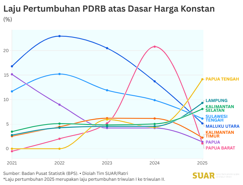 - From the first quarter to the second quarter of 2025, Central Papua, Lampung, and South Kalimantan grew by 14.15%, 9.33%, and 8.10%, respectively. Over the past five years, the growth of these three provinces has consistently increased. Other provinces such as North Maluku, Central Sulawesi, and Papua experienced a spike in growth rate in 2021, but experienced a decline until 2024.