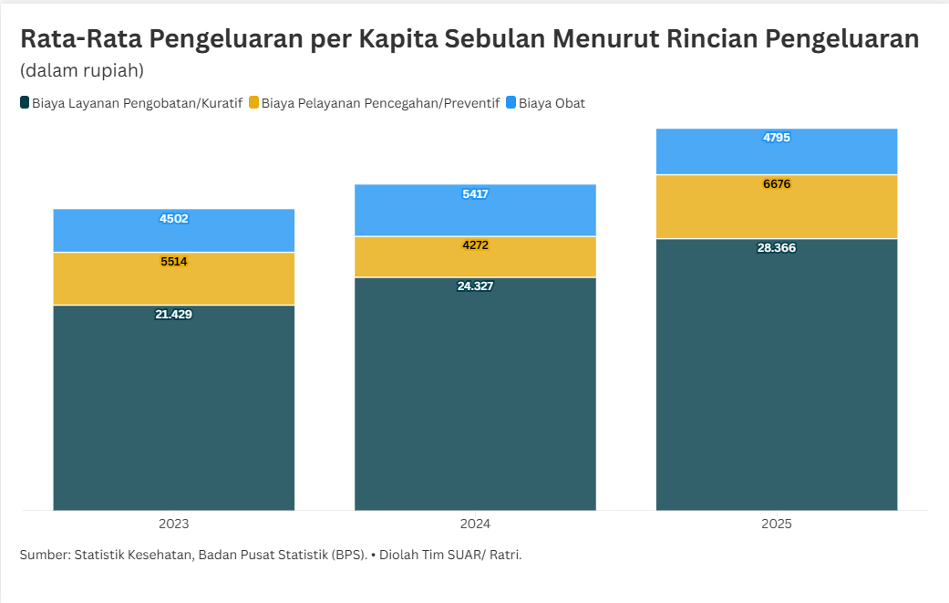 - The most significant increase occurred between 2024 and 2025, with monthly expenditure rising from Rp 146,309 to Rp 160,873. This 9.95% increase absorbed a larger portion of people's income, reaching 10.25% of total monthly expenditure. This double-digit figure indicates that the health sector is a priority in household budgets. More specifically, public health spending is currently still focused on medical or curative services, which account for a very large portion, exceeding 70%. The allocation of costs for treatment has even increased in the period from 2023 to 2025, with an increase of around 13%-16%.