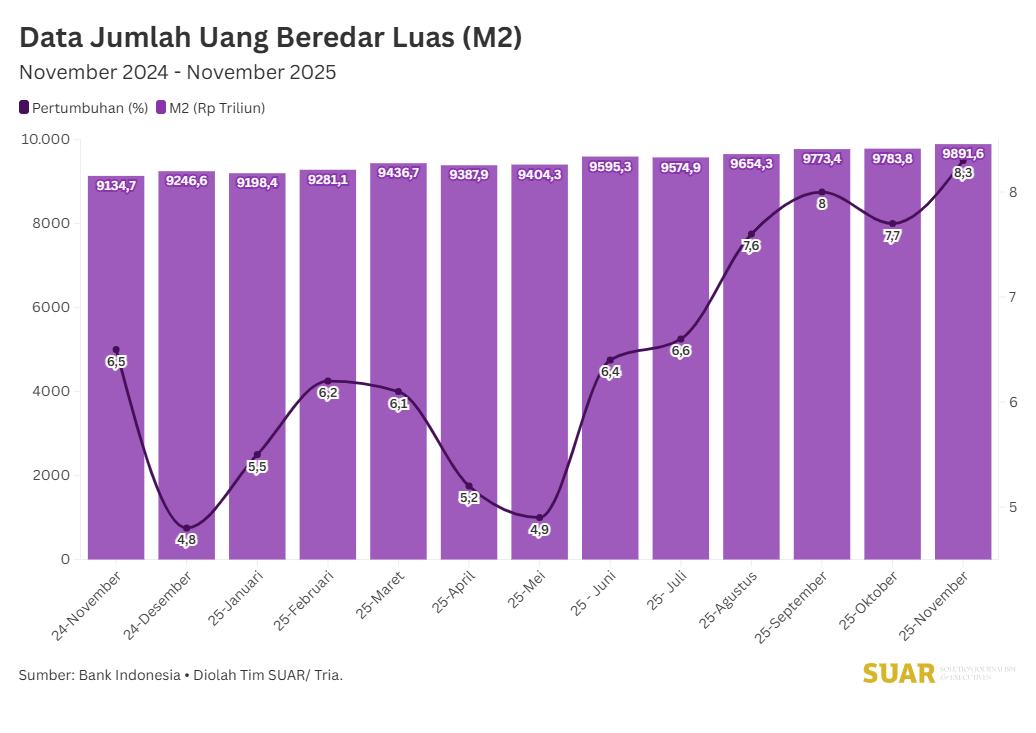 - Bank Indonesia (BI) announced that economic liquidity or broad money supply (M2) grew 8.3% year-on-year ( YoY) in November 2025. In addition to an increase in net bills to the central government, bank lending growth of 7.9% in November 2025 also contributed to this growth. This signal is expected to trigger real consumption in the fourth quarter of 2025, which will determine the annual economic growth rate. The recorded M2 growth of IDR 9,891.6 trillion was driven by the growth of narrow money supply (M1) by 11.4% YoY, amounting to IDR 5,748 trillion, driven by the development of rupiah savings that can be withdrawn at any time, as well as currency outside commercial banks and rural banks.