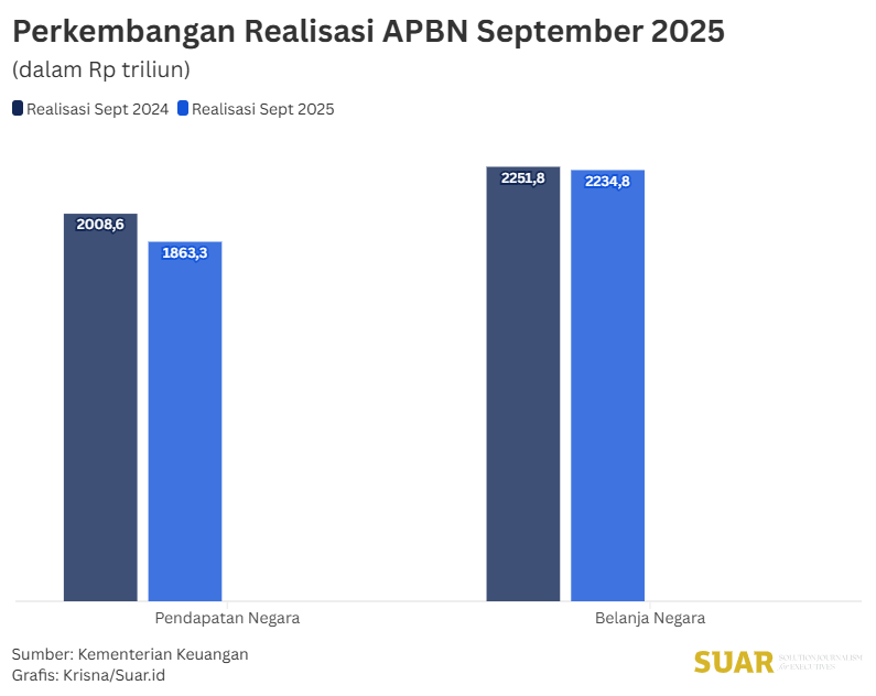 - Entering the fourth quarter, the Ministry of Finance revealed the potential state revenue that must be pursued until the end of 2025. Spending absorption has not yet reached the outlook. Therefore, the selection of expenditure with high absorption and pursuing tax compliance ahead of SPT reporting are two ways to ensure the growth target is achieved in the remaining three months of the 2025 State Budget. As of September 2025, state spending has reached IDR 2,234.8 trillion or 63.4% of the 2025 outlook , while state revenue has reached IDR 1,863.3 trillion or 65% of the 2025 outlook . Of this amount, the state budget deficit is maintained at IDR 371.5 trillion or 1.56% of GDP.