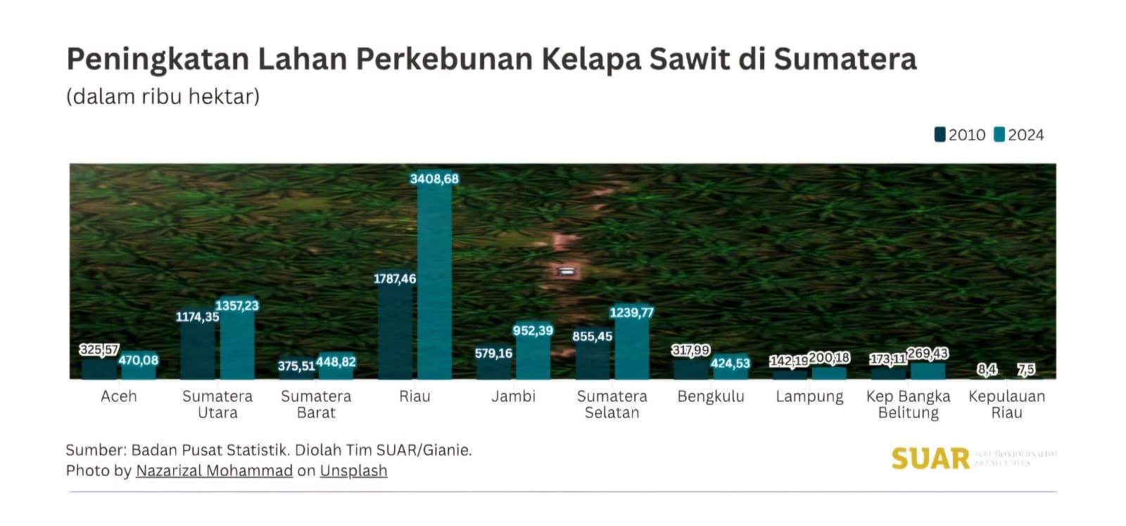 - The island of Sumatra plays a very dominant role in Indonesia's palm oil industry. Of the total area of national palm oil plantations, which reaches 16 million hectares, more than half is located on the island of Sumatra. Over the past 1.5 decades, data from the Central Statistics Agency (BPS) shows that the area of Indonesian palm oil plantations has increased from 9 million hectares in 2010 to 16 million hectares in 2024. With this 76% increase in area, production has reached 47 million tons, making Indonesia the world's leading producer of palm oil.