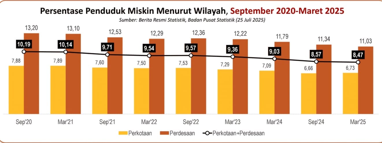 The Central Statistics Agency (BPS), which finally released poverty figures for March 2025 on Friday (25/7/2025), stated that the total percentage of Indonesia's poor population as of March 2025 was recorded to have fallen to 8.47%. This figure is down slightly by 0.1 percent compared to September 2024. This is the lowest figure in the last two decades.