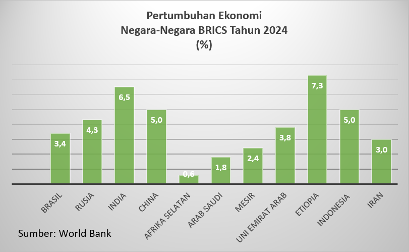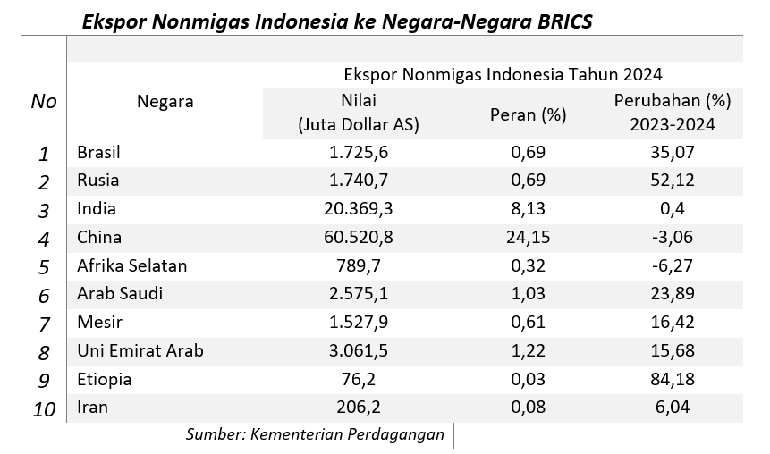 Indonesia's joining BRICS opens up opportunities to increase economic cooperation, especially non-oil and gas exports to member countries. Until 2024, the value of Indonesia's non-oil and gas exports to the other 10 member countries was recorded at US$92.5 billion, or about 37 percent of total non-oil and gas exports. The largest portion of Indonesia's non-oil and gas exports is to China (24.15 percent) and India (8.13 percent).