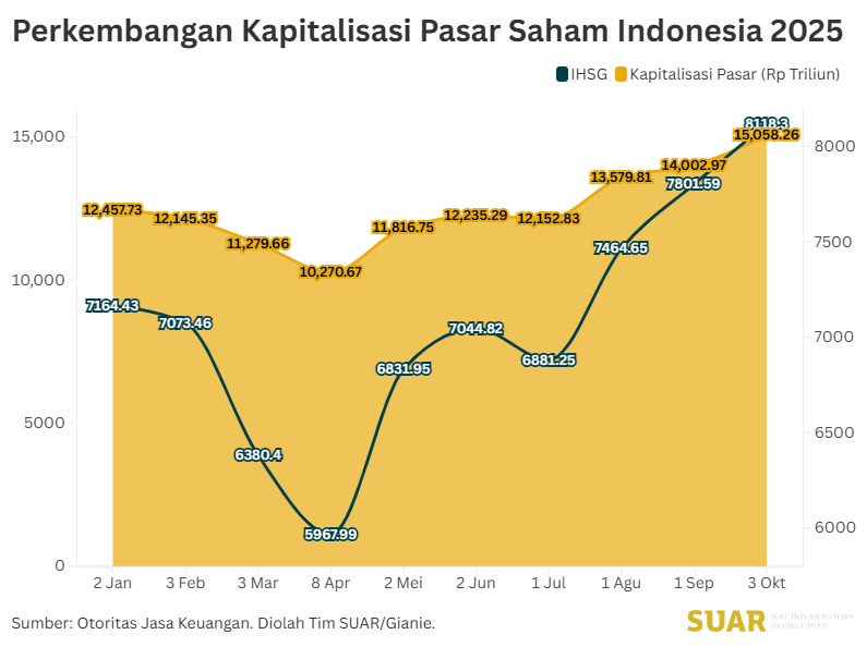 - The government is trying to restore investor confidence in the financial markets. The reason is that the Prabowo administration has only been running for 6 months, the Composite Stock Price Index (CSPI) and market capitalization have fallen quite deeply. On April 8, 2025, the market cap shrank to Rp 10,270 trillion when the JCI fell to 5,967.99. A gradual recovery took place towards the one-year anniversary of the government.