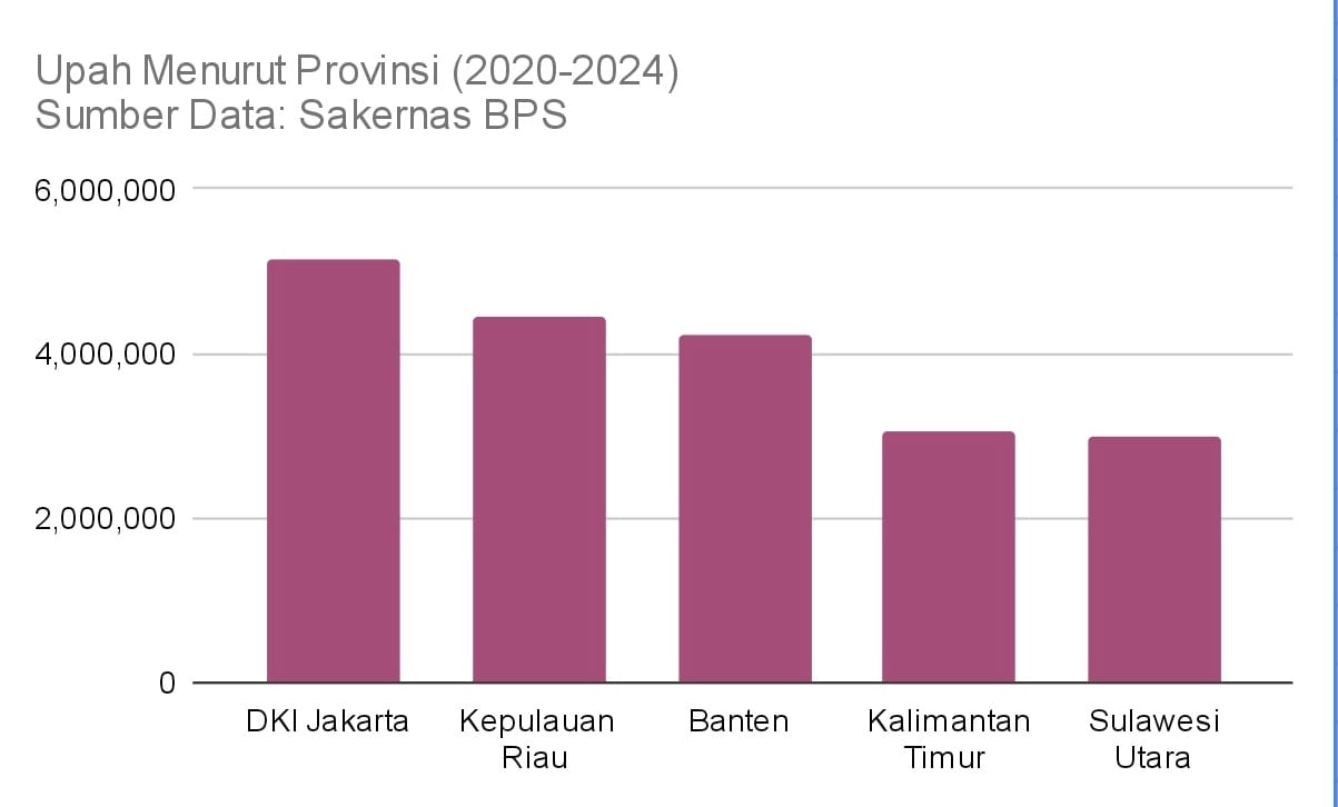 The wages of Indonesian workers also vary, indicating income inequality. There are some regions where workers' wages are above average, such as DKI Jakarta with IDR 5.1 million per month. Compared to other provinces, DKI Jakarta's wage is the highest and has experienced a 95 percent increase in 2024. In addition, there are also Riau Islands with an average wage of Rp 4.4 million per month. Furthermore, there is Banten with a wage of IDR 4.2 million per month.
