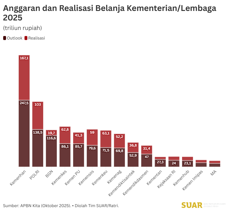 - The realization of expenditures by ministries and institutions (K/L) until 30 September 2025 was recorded at IDR 800.9 trillion or only 62.8% of the 2025 State Budget outlook set at IDR 1,275.6 trillion. Although showing progress, this figure suggests the need to accelerate the implementation of spending in the last months of the fiscal year.