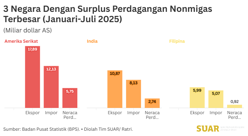 - Nationally, from January to August 2025, Indonesia's export value reached US$ 185.12 billion, up 7.72% compared to the same period last year of US$ 171.86 billion. Not only that, Indonesia also recorded a cumulative trade surplus of US$ 29.14 billion, growing 53.3% compared to last year which was only US$ 19.1 billion. For 64 consecutive months since May 2020, Indonesia's trade balance has continued to surplus.