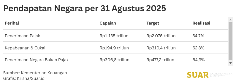 - Regarding the state revenue realization of IDR 1,638.7 trillion, which only reached 57.2% of the 2025 state budget outlook, according to Deputy Minister of Finance Anggito Abimanyu, there are still a number of challenges and opportunities to maximize state revenue until the end of 2025.
