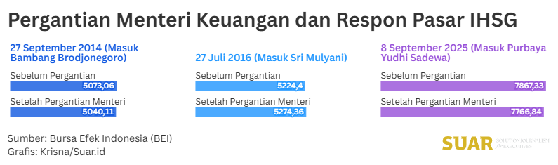 - In Indonesia's history, the change of Finance Minister has been responded to variously by financial market participants. There are times when the market responds positively to the change of the country's fiscal general. However, there are times when the market responds otherwise. Flashback to 11 years ago, precisely on September 27, 2014, the Composite Stock Price Index (JCI) closed down 32.95 points or 0.65% at 5,040.11. This weakening coincided with the inauguration of the Working Cabinet of President Joko Widodo (Jokowi). At that time the position of Minister of Finance was entrusted to Bambang P.S Brodjonegoro.