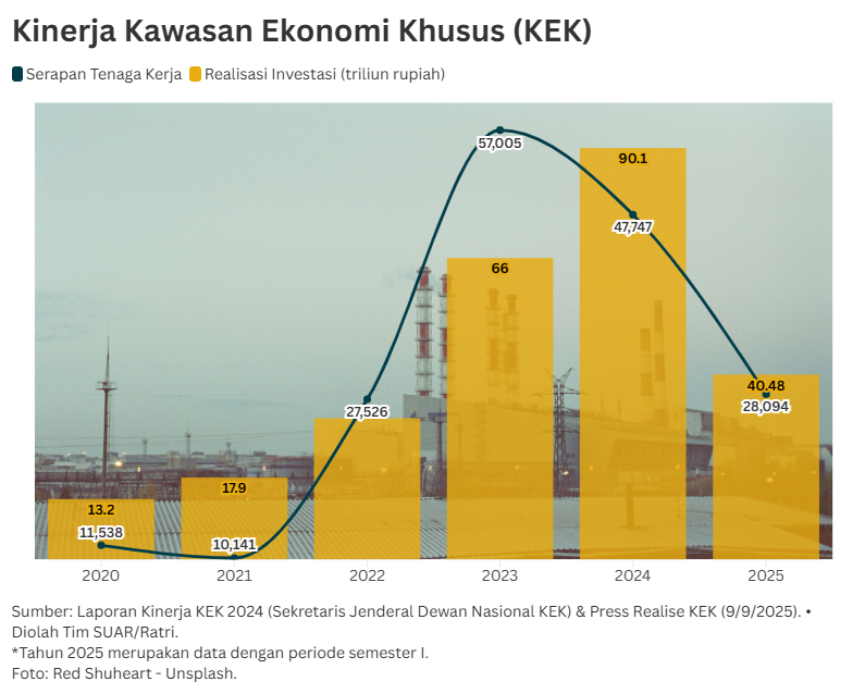 - Special economic zones (SEZs) are one of the main instruments to accelerate economic growth. The concept is not just to build industrial estates, but to create an efficient investment ecosystem that is a magnet for foreign and domestic investors. The 2024 performance report shows that this strategy is starting to bear fruit. Investment achievements in SEZs across Indonesia jumped significantly, from IDR 13.2 trillion in 2020 to IDR 90.1 trillion in 2024.