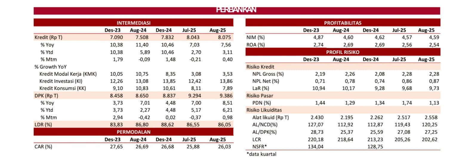 Dian revealed that banking intermediation performance is currently stable with a maintained risk profile and banking operational activities remain optimal to provide financial services for the community. In August 2025 credit grew by 7.56 percent yoy.
