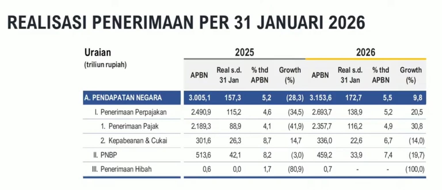 "Realisasi penerimaan negara Rp 172,7 T atau tumbuh 9,8 persen secara tahunan (yoy) dan ini merupakan pencapaian yang perlu disyukuri di awal tahun," kata Purbaya dalam Rapat Kerja bersama Komisi XI DPR RI di Gedung Parlemen Senayan, Jakarta (4/2/2026).