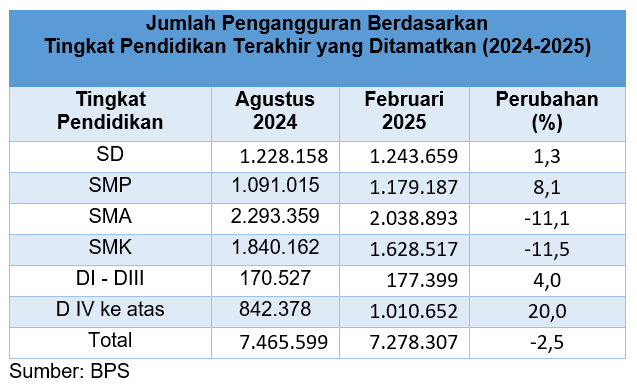 In the midst of a sluggish economy, BPS data shows that the number of unemployed people has decreased, from 7,465,599 people (August 2024) to 7,278,307 people (February 2025) or a decrease of 2.5 percent. The largest portion of unemployment comes from the population whose last education is high school and vocational school, namely 50.4 percent (3.6 million). This share decreased compared to the condition in August 2024, which was 55.3 percent (4.1 million). Unemployment among high school and vocational school graduates decreased by 11.1 percent and 11.5 percent, respectively.