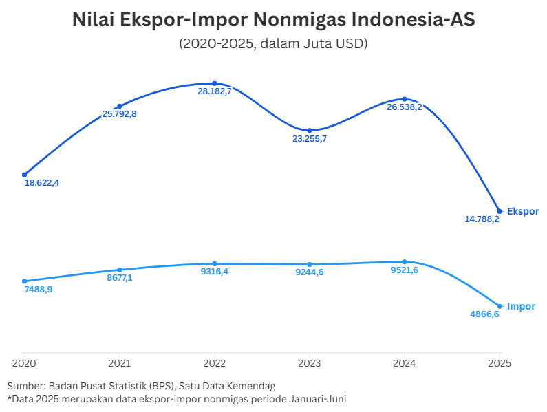 - Meanwhile, the value of imports from the US to Indonesia in the first semester of 2025 was recorded at USD $4,866 million, up 6.8% compared to the same period last year. Thus, the Indonesia-US trade balance was a surplus of nearly USD $10,000 million.