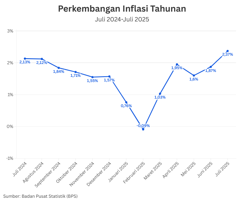 - The Central Statistics Agency (BPS) reported an inflation rate of 2.37% year-on-year in July 2025. This inflation rate is still within the target range for inflation control this year set by the government and Bank Indonesia (BI), which is 1.5%–3.5%.