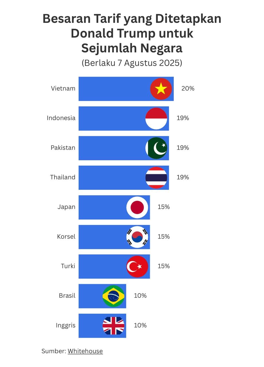 - US President Donald Trump set new import tariffs for more than 68 countries that will take effect on August 7, 2025, on Thursday (31/7/2025) Washington DC time or Friday (1/8/2025) afternoon WIB. Indonesia was rewarded with a 19% tariff. Meanwhile, competing countries such as Vietnam are subject to tariffs of 20% and Thailand 19%.