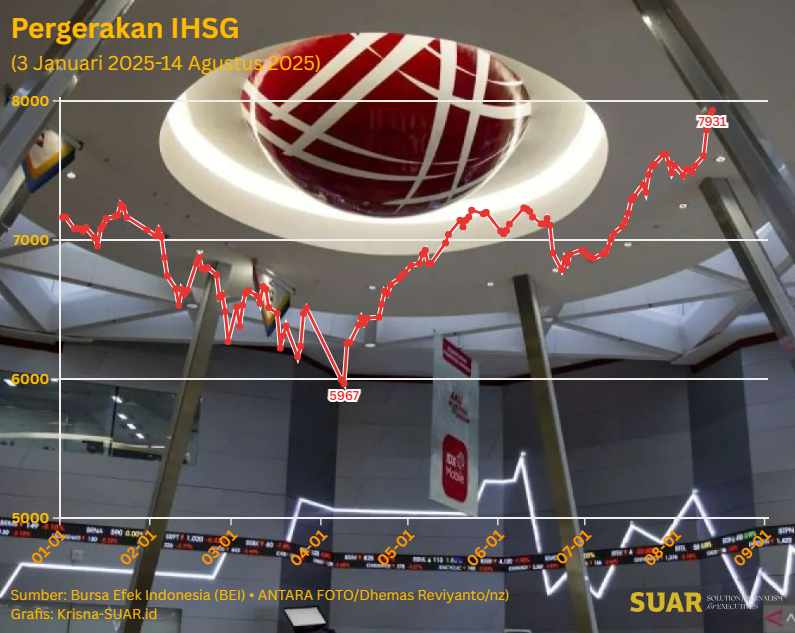 - The Composite Stock Price Index (IHSG) recorded its highest record in history at the close of trading on Thursday (14/8/2025), reaching a level of 7,931 – up 0.49% compared to the opening. This breaks the previous record of 7,910 on September 19, 2024.