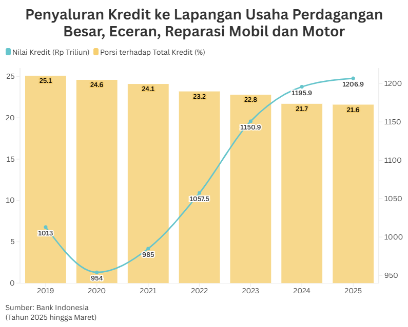 - The business field that received the most credit disbursements until March 2025 was trade, namely 1,206.9 trillion or 21.6 percent of total credit by business field. Nominally, credit to the trade sector grew by an average of 3.5% per year (during the 2019-2024 period). However, its share tends to decline from 25% (2019) to 21.7% (2024).
