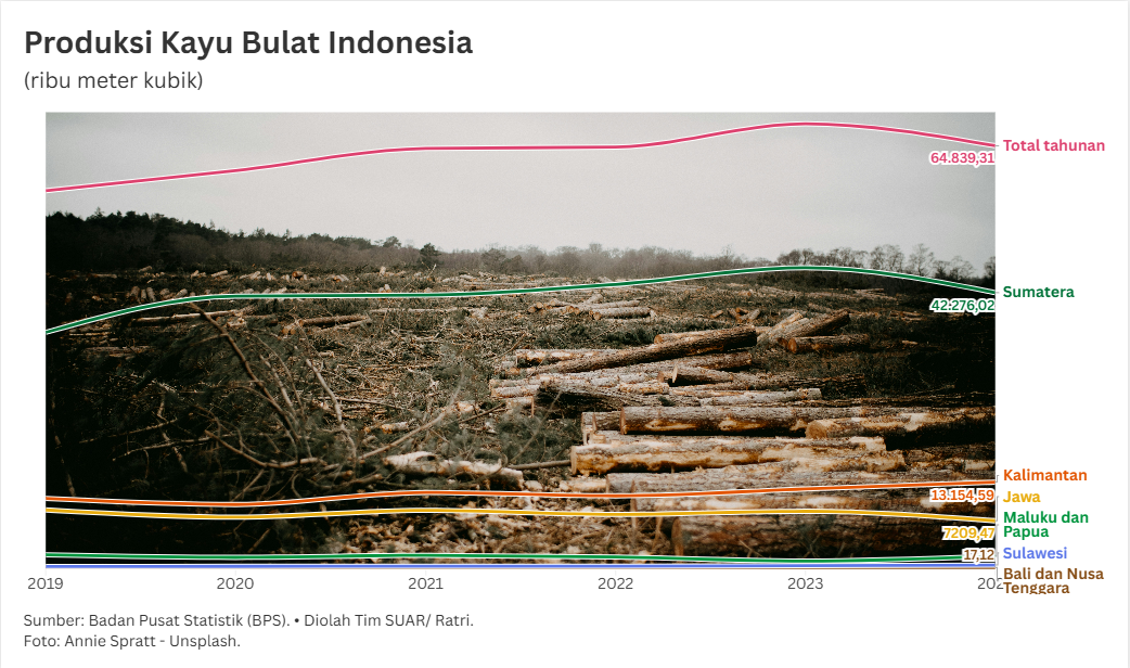 - National timber production grew significantly, starting from 57.930 million cubic meters in 2019 and peaking at 68.215 million cubic meters in 2023. In 2024, production declined slightly to 64.839 million cubic meters. Geographically, roundwood production in Indonesia is dominated by two main regions, namely Sumatra and Kalimantan. The contribution from these two regions has consistently been the mainstay of national production.