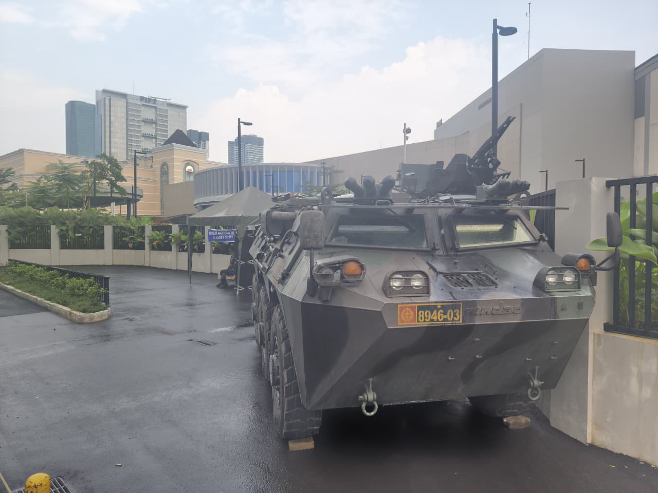 Moving 12 kilometers to the west, the authorities conducted extra security at Puri Mall Indah. Several members of the Army were seen standing guard next to the entrance gate of the Puri mall. They came with Panser Anoa combat vehicles (ranpur).