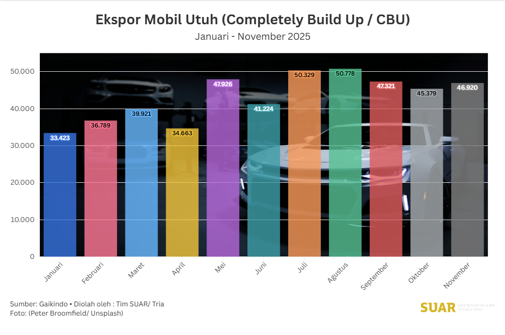 - Based on data from the Indonesian Automotive Industry Association (Gaikindo), CBU exports in November 2025 were recorded at 46,920 units, up 3.4% compared to the previous month, which reached 45,379 units. Cumulatively from January to November 2025, CBU car exports were recorded at 473,971 units, an increase of 10.6% compared to the same period in 2024, which reached 428,613 units. The main factors driving CBU exports are stable global market demand and high market demand for ready-to-use units despite the global economic slowdown.